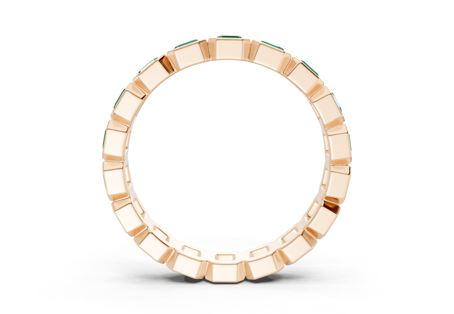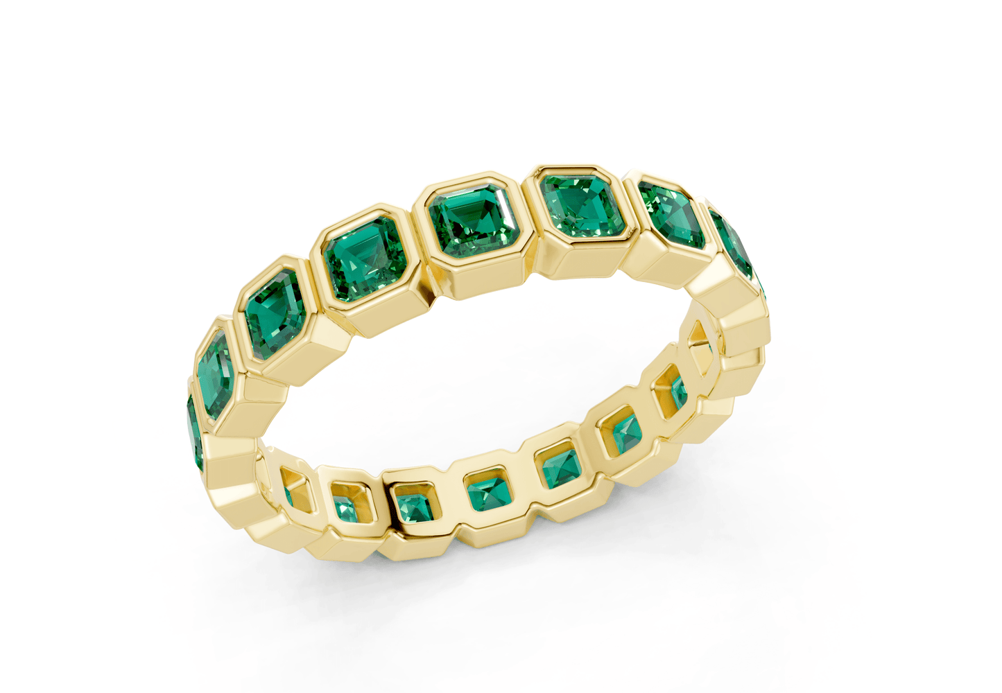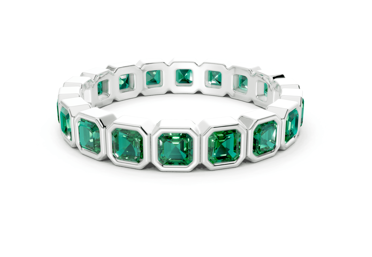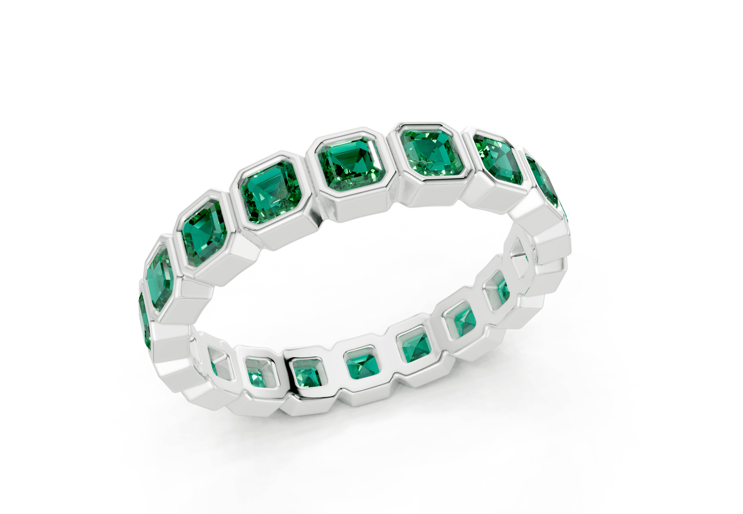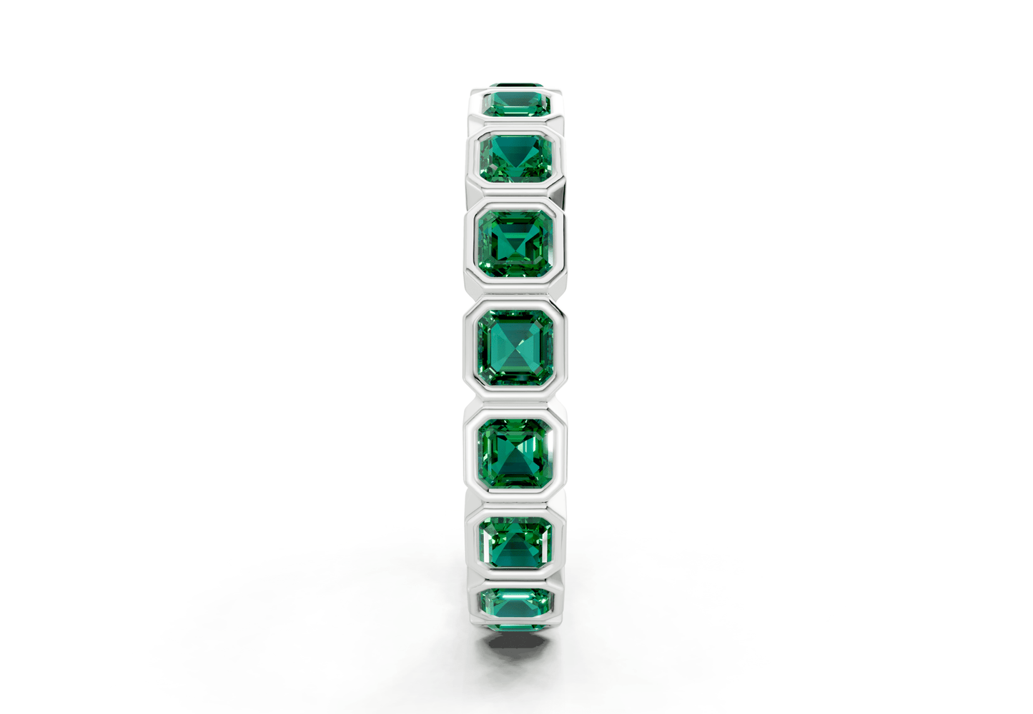 Command attention with our Elysees Asscher Cut Emerald Gemstone Eternity Band 6½ Carat Total Wt.. Set with 6.5ct of lush green Asscher cut emeralds, set in your choice of gold or platinum. With VS-VVS clarity, each ring is finished to perfection for rich color and elegance. Presented in a stunning jewelry box for the perfect gift.