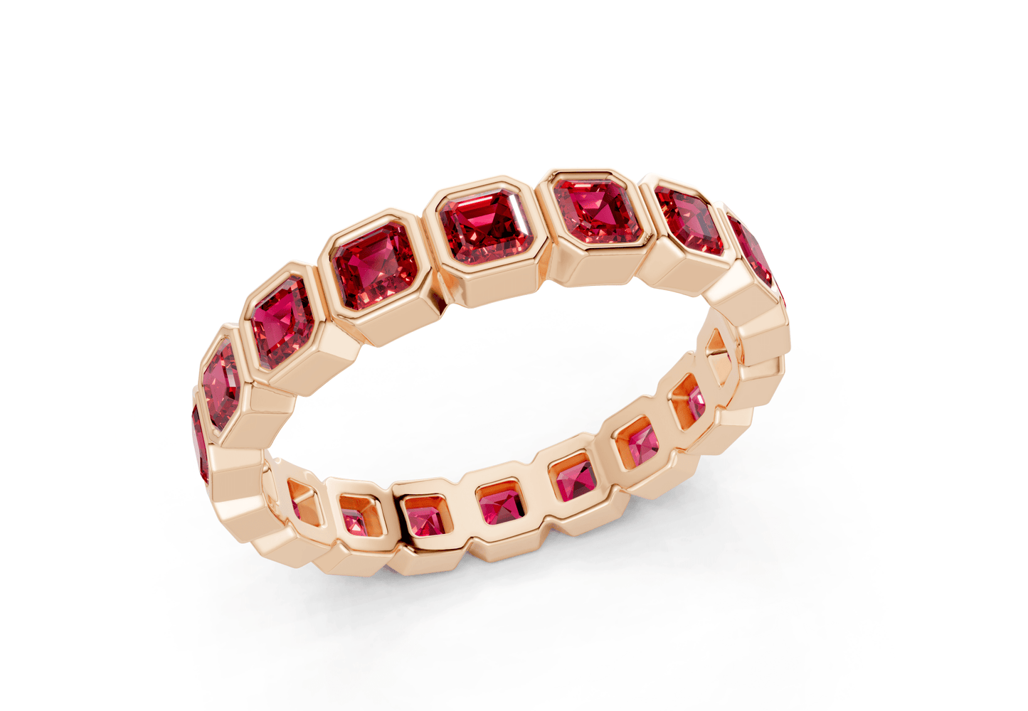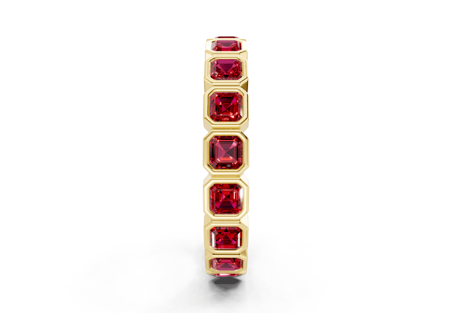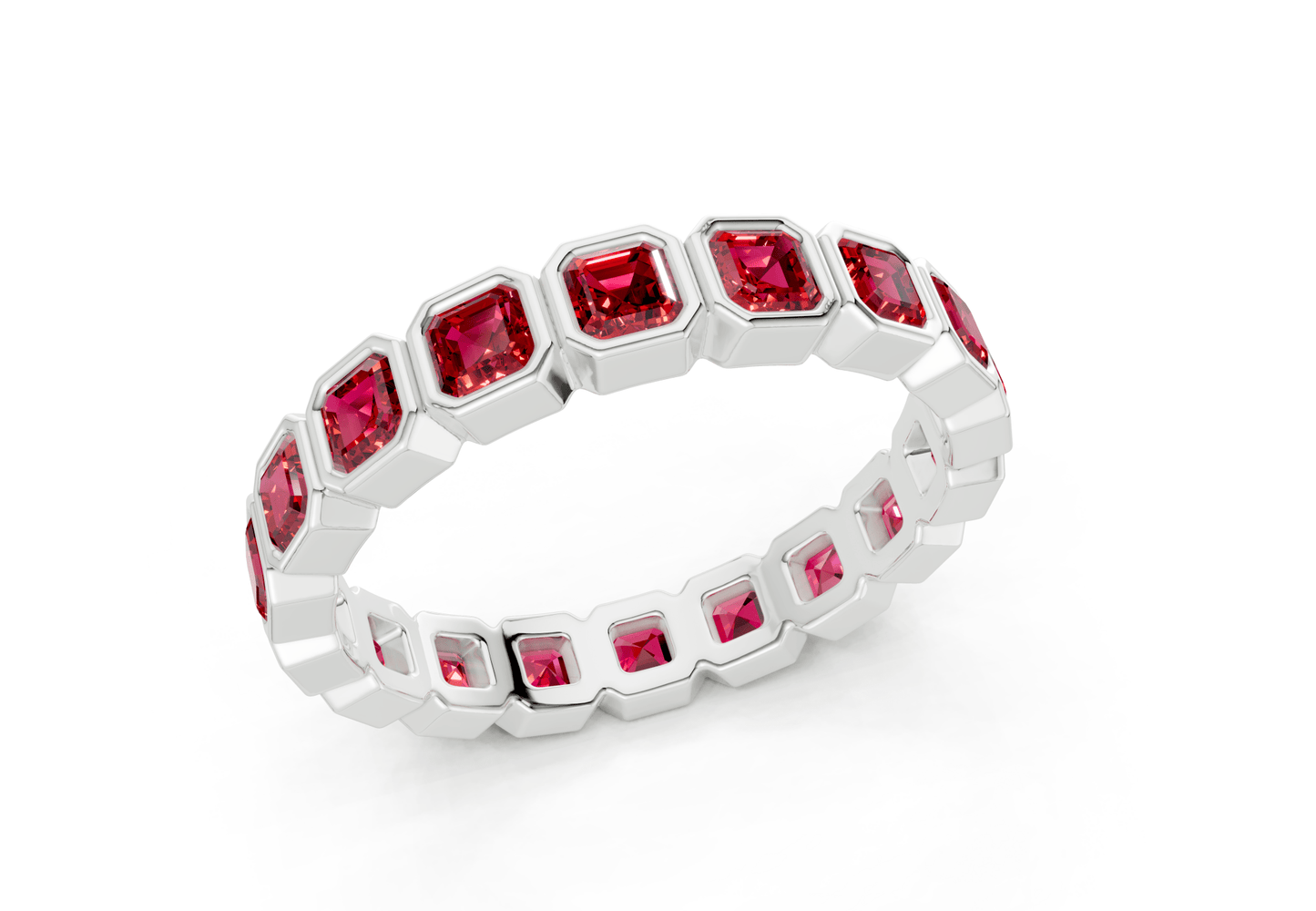A passionate display of sophistication with our Elysees Asscher Cut Ruby Gemstone Eternity Band 6½ Carat Total Wt.. Featuring 6.5ct of striking red Asscher cut rubies, set in your choice of gold or platinum. With VS-VVS clarity, each ring is finished to perfection for timeless love. Presented in a stunning jewelry box for the perfect gift.