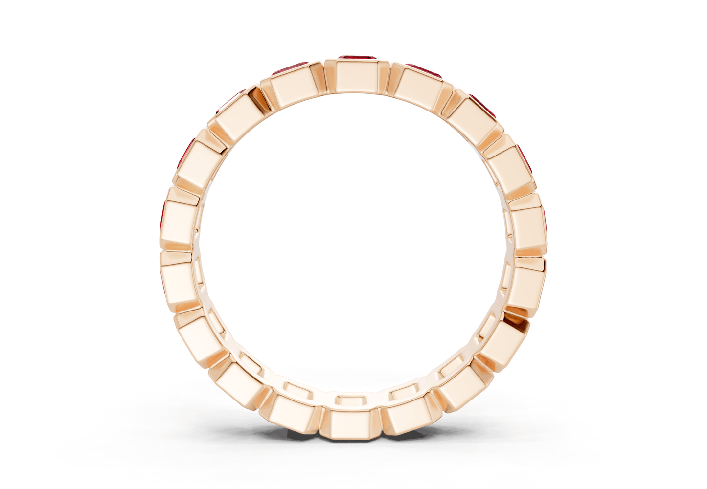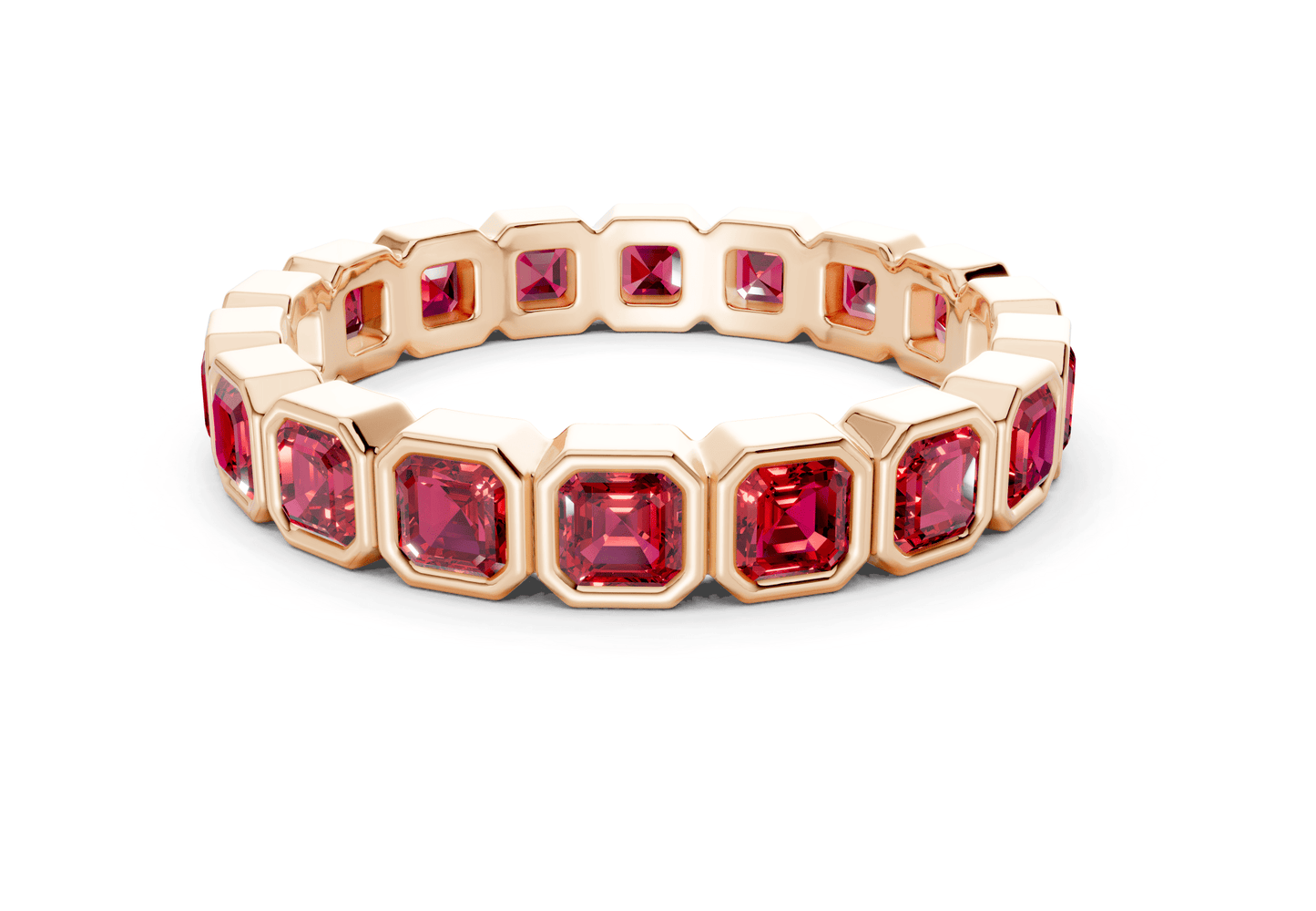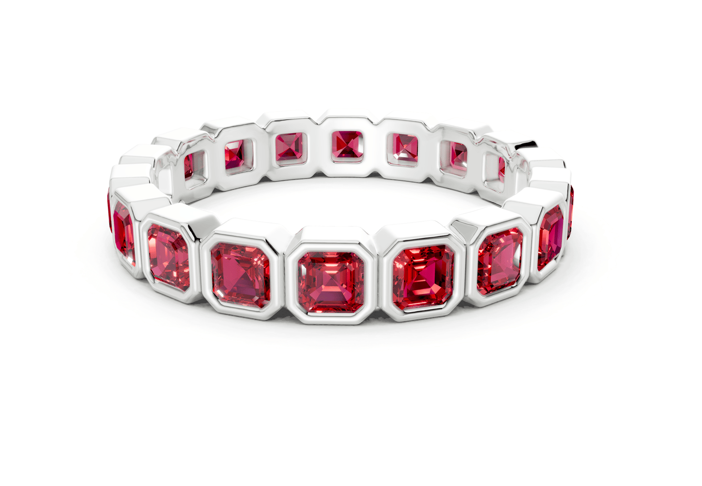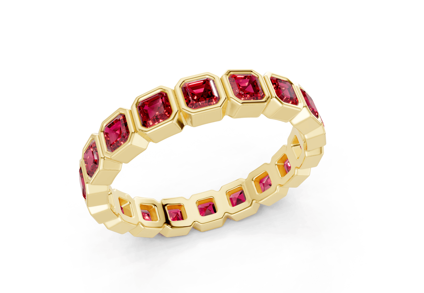 A passionate display of sophistication with our Elysees Asscher Cut Ruby Gemstone Eternity Band 6½ Carat Total Wt.. Featuring 6.5ct of striking red Asscher cut rubies, set in your choice of gold or platinum. With VS-VVS clarity, each ring is finished to perfection for timeless love. Presented in a stunning jewelry box for the perfect gift.