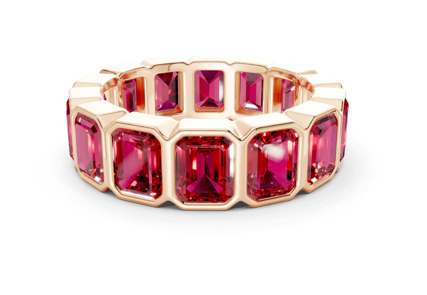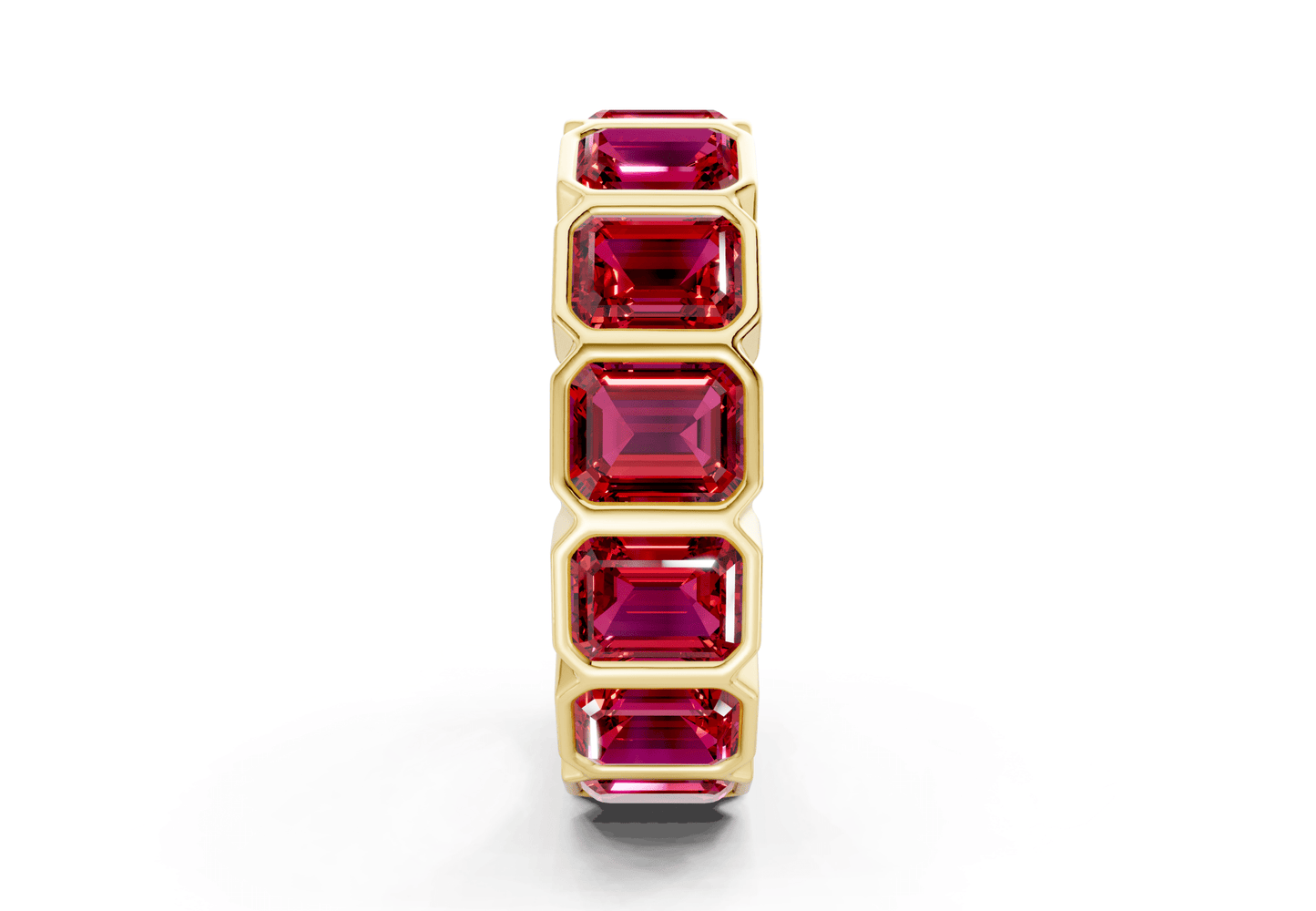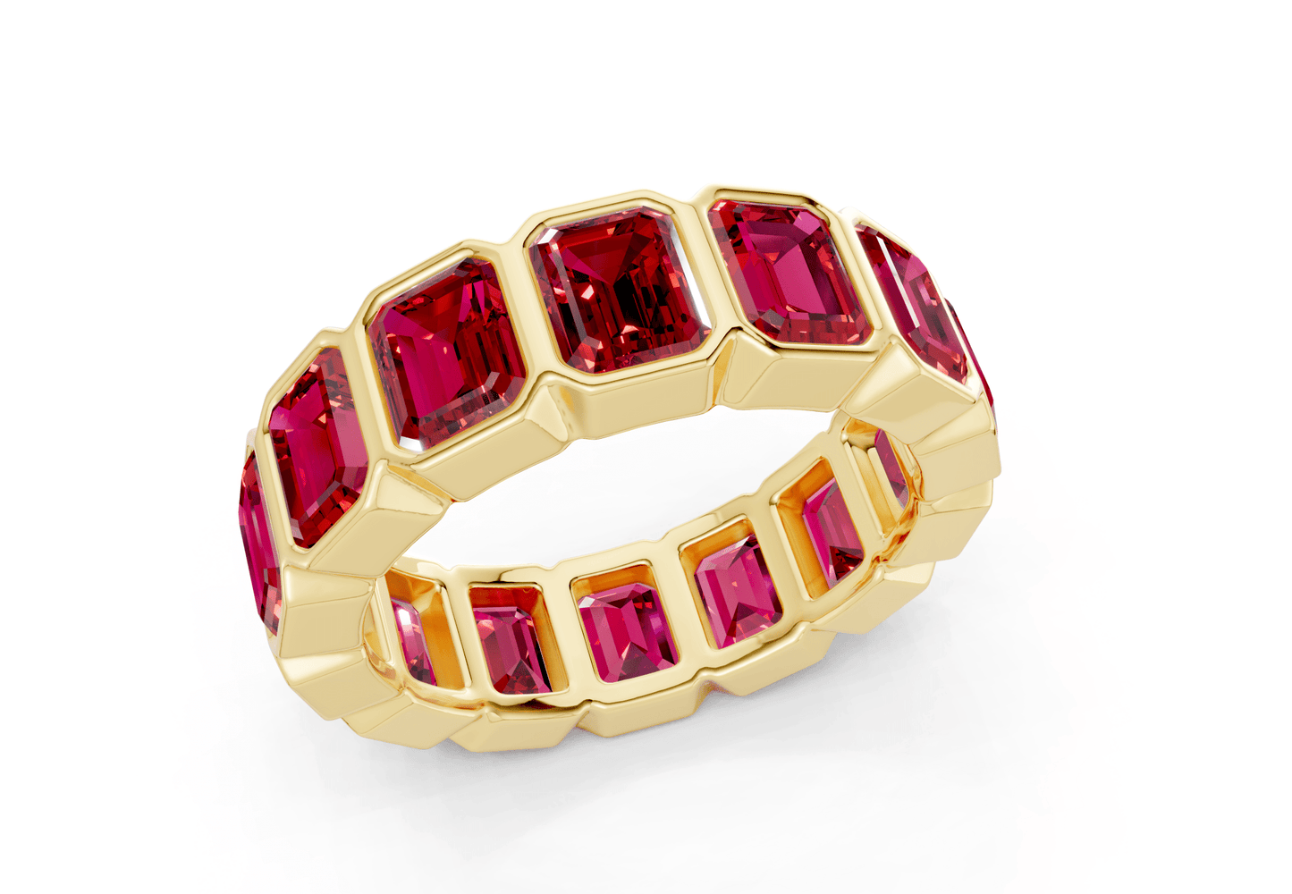 Command attention with our Elysees Emerald Cut Ruby Gemstone Eternity Band 6½ Carat Total Wt.. Set with 6.5ct of lush green Asscher cut emeralds, set in your choice of gold or platinum. With VS-VVS clarity, each ring is finished to perfection for rich color and elegance. Presented in a stunning jewelry box for the perfect gift.