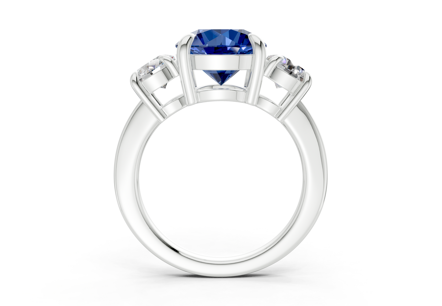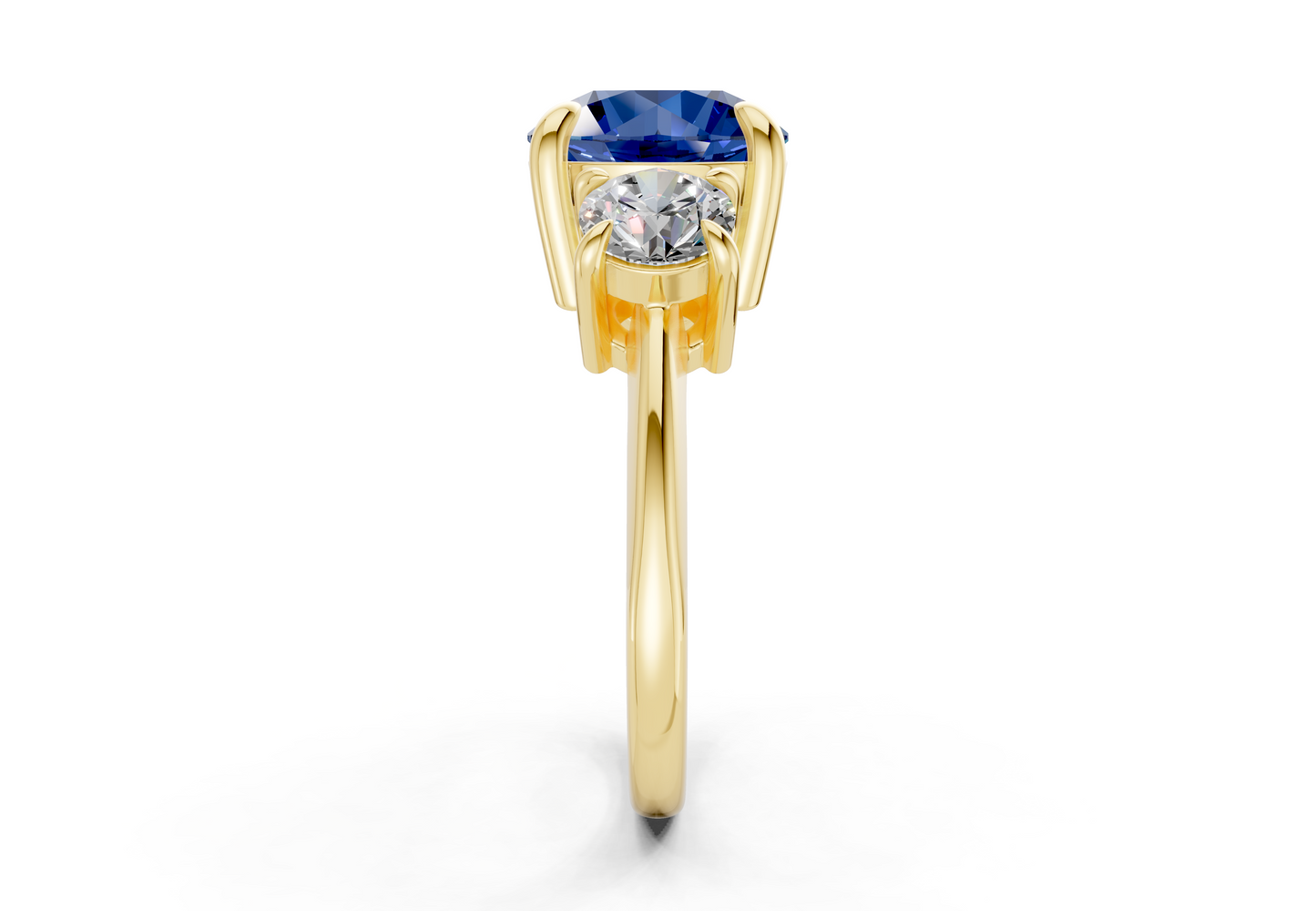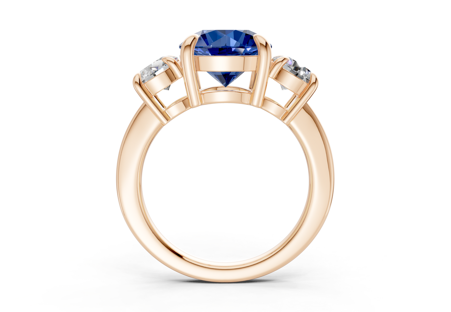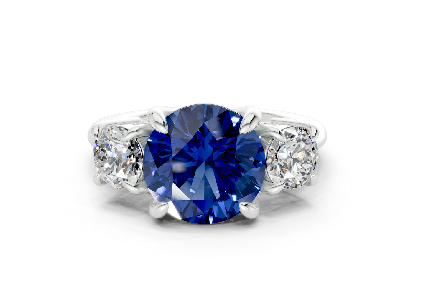 The Valencia Sapphire Gemstone ring features a mesmerizing Round-cut Sapphire Gemstone center , flanked by two additional stones that represent your past, present, and future together. Thoughtfully designed to highlight the diamond’s unique beauty, this timeless piece blends modern elegance with deep symbolism. Perfect for those who cherish meaningful design, with the option for custom engraving to make it even more personal.