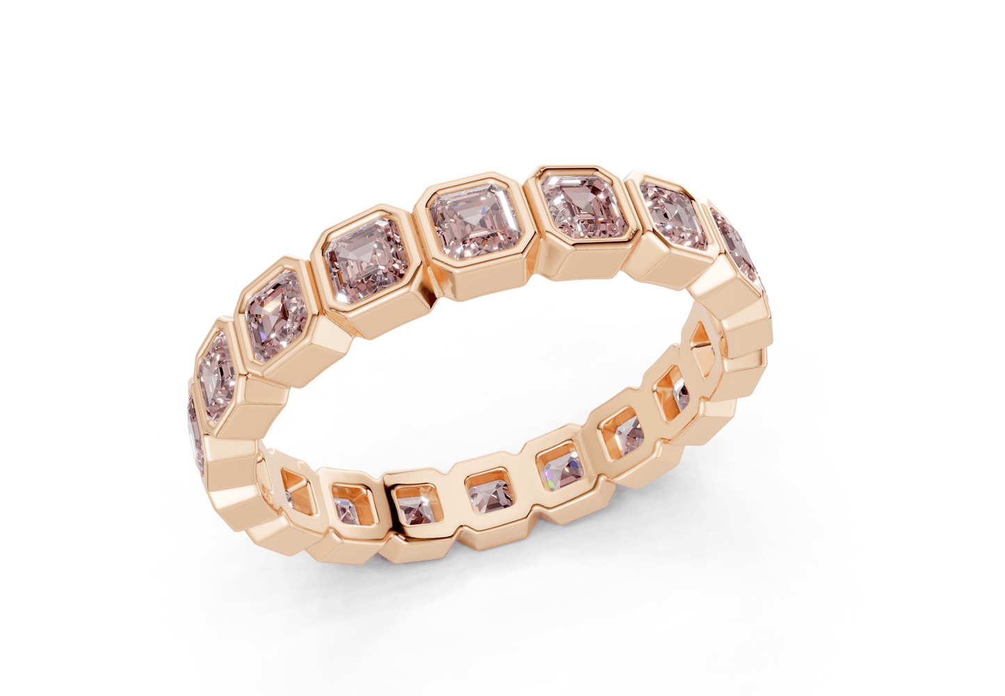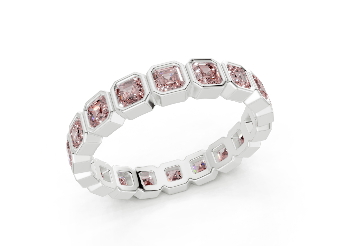 Experience elevated romance with our Elysees Asscher Cut Pink Diamond Eternity Band 6½ Carat Total Wt.. Showcasing 6.5ct of soft pink lab-grown Asscher cut diamonds, set in your choice of gold or platinum. With VS-VVS clarity, each ring is finished to perfection for a true testament to enduring beauty. Presented in a stunning jewelry box for the perfect gift.