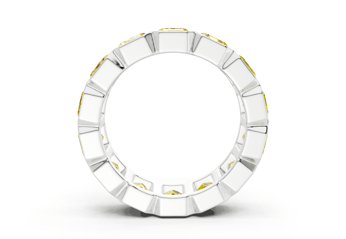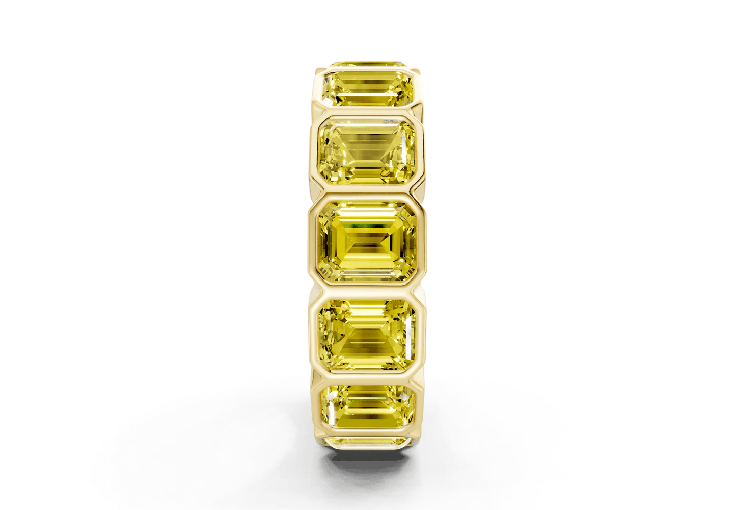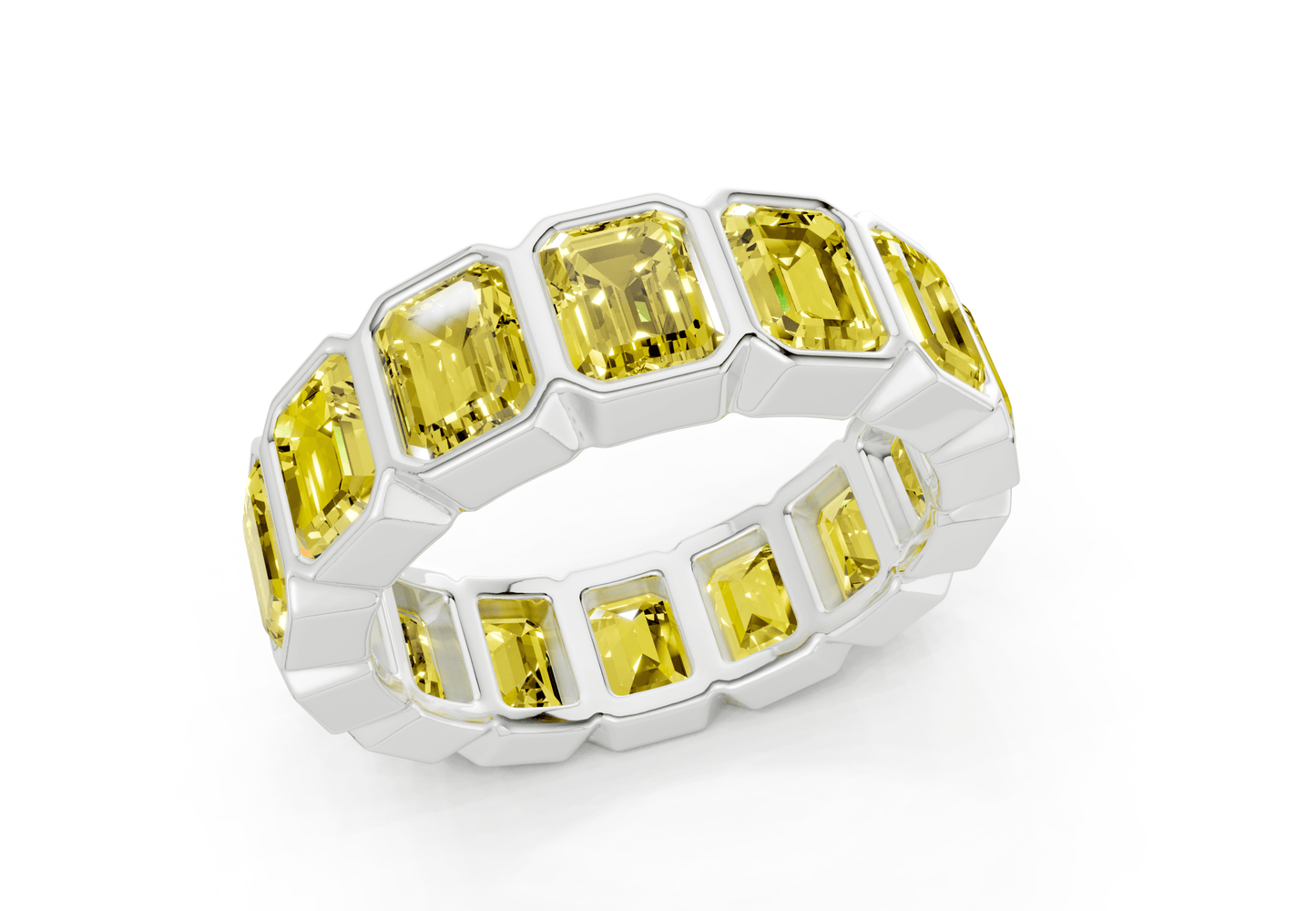 Indulge in timeless elegance with our Elysees Emerald Cut Yellow Diamond Eternity Band 6½ Carat Total Wt.. Featuring 6.5ct of bezel-set Asscher cut yellow lab-grown diamonds, set in your choice of gold or platinum. With VS-VVS clarity, each ring is finished to perfection for a radiant and luxurious look. Presented in a stunning jewelry box for the perfect gift.